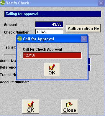 Enter the authorization number in the Call for Check Approval box. Click OK